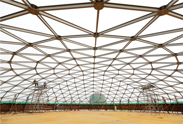 碳鑫科技公司20000立方米的乙醇成品罐,正進行罐頂部網(wǎng)殼拼裝。王明明攝