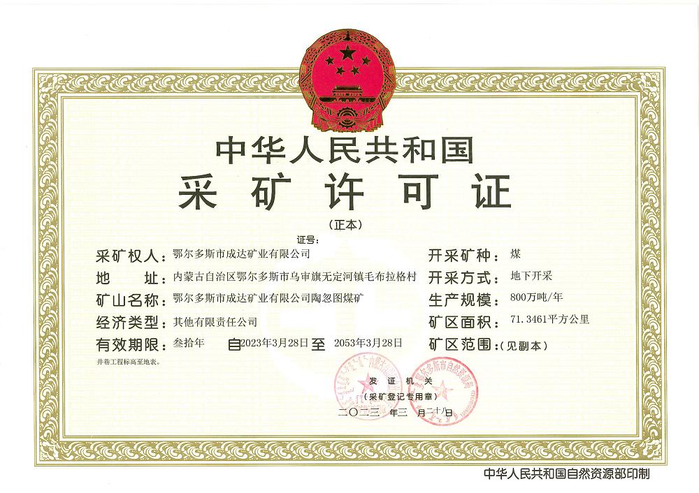 3月28日獲悉,內蒙古自治區自然資源廳、鄂爾多斯市自然資源局向淮北礦業集團下屬成達礦業有限公司頒發了陶忽圖煤礦采礦許可證。這標志著淮北礦業集團下屬成達公司陶忽圖煤礦項目報批工作繼取得項目核準和環評報告批復后,又一次取得實質性突破。
